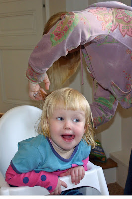 So drastic action was taken, I decided to do it myself...What started as a trim, ended as a restyle, and I only know one style. I followed her round most of the day with a pair of scissors clipping off the stray ends. It was a bit like the table leg story. Anyway the end result is pretty reasonable. Luckily the curl will hide the imperfections for the time being, and it looks sort of cute.