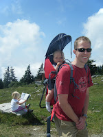 On Sunday we went for a hike, to further test out Bella's new walking boots. After an initial moan she did really well and after climbing up the hill, she practically ran all the way back down again. As you can see Bella also takes her map reading very seriously. This time Malc got to carry Sebby. We had lunch at a mountain top restaurant with a view. As their only high chair was occupied we improvised with the car seat (erm yes we did actually drive there). We had our first cheese fondue since arriving in Switzerland (take note Jo for your next visit) and Bella had quite possibly the biggest sandwich in the World. We also met the biggest snail in the World along the way. Quite a day.